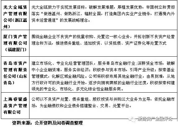 值得注意的是,除去主流的不良資產處置業務、資產管理業務、投資與咨詢等方面的業務外。部分資產管理公司另辟蹊徑,開展了一些較為獨特的業務。具體來看,較為特殊的有上海國有資產經營有限公司的不動產投資業務、重慶渝富資產經營管理集團有限公司的土地經營和城市建設業務以及福建省閩投資產管理有限公司的對金融、基礎設施、高新技術產業、工業、制造業、服務業的投資與管理業務等等。上述業務的開展,很大程度上與地區的行業優勢或地方政府的相關規劃和發展需要相關。